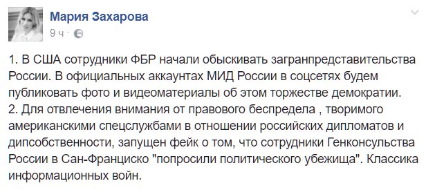 В торговом представительстве РФ в Вашингтоне проходят обыски. В здании, которое российская сторона передала США, работают сотрудники ФБР. В Москве подчеркивают, что действия Соединённых Штатов серьёзно нарушают международное право, в частности Венскую конвенцию о неприкосновенности дипсобственности. Официальный представитель внешнеполитического ведомства России Мария Захарова заявила, что Вашингтон предпринимает попытки отвлечь внимание от «правового беспредела» и с этой целью запускает фейки, порочащие российских дипломатов.